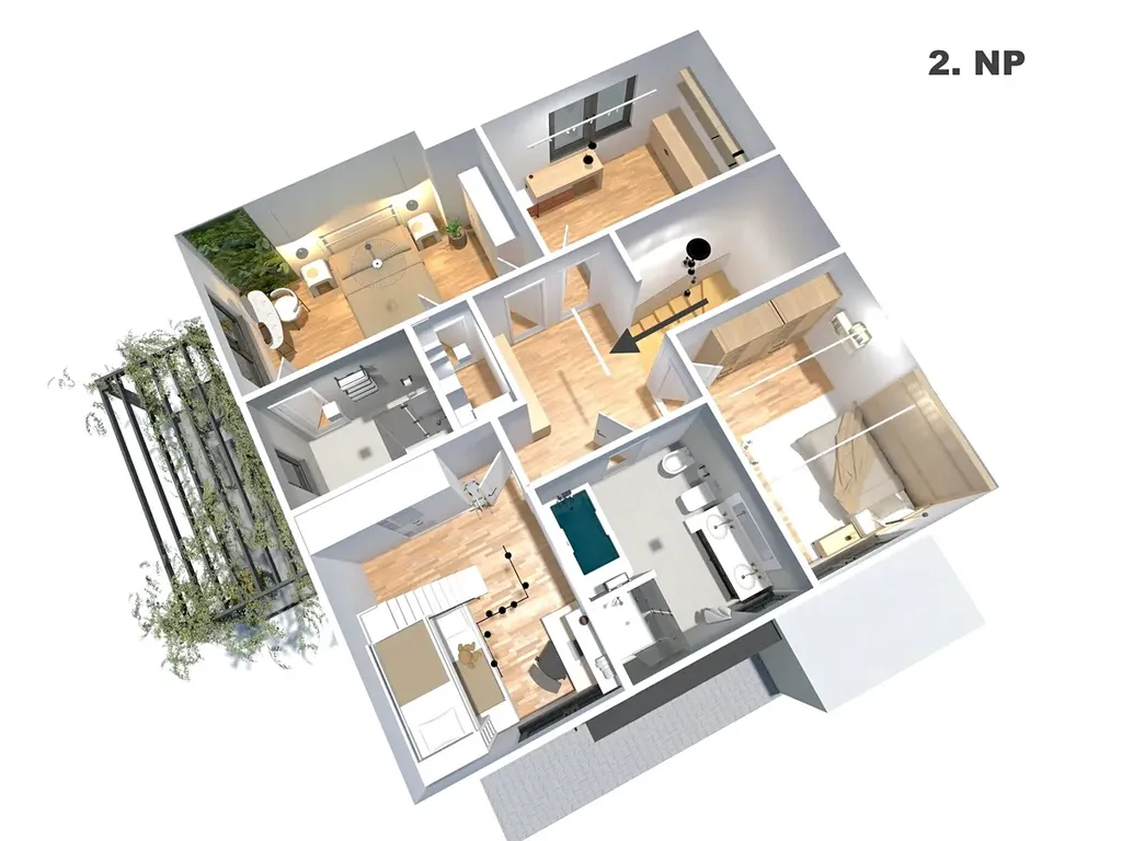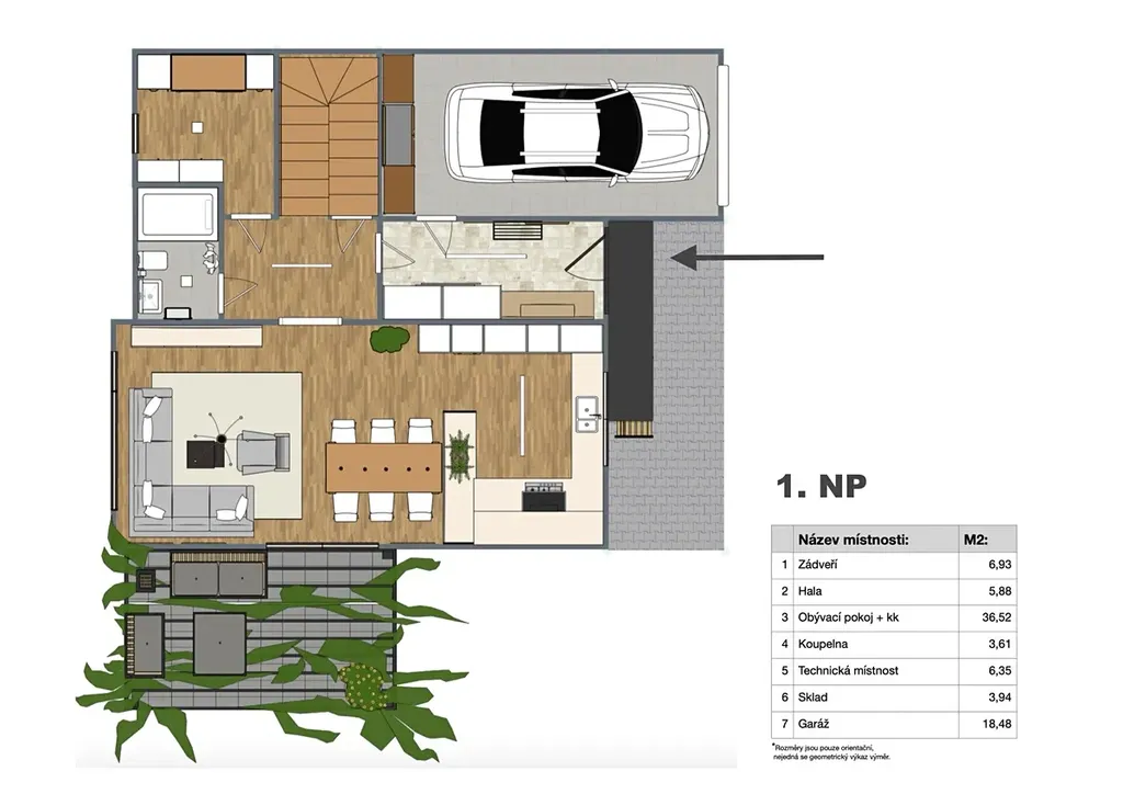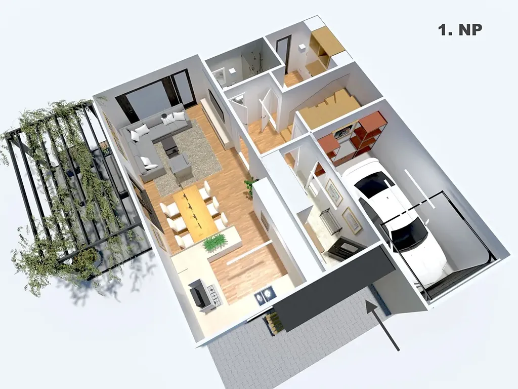 1.NP vás přivítá elegantním zádveřím (6,92 m²) a halou (5,88 m²). Srdcem domu je velkorysý obývací pokoj s kuchyní a jídelnou (36,52 m²). Dále zde najdete koupelnu se sprchovým koutem a toaletou, technickou místnost, sklad a garáž pro jeden automobil (18,48 m²).