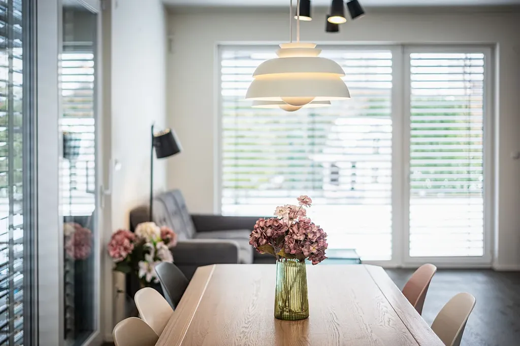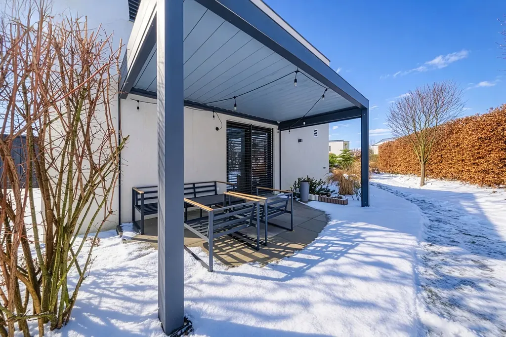 Z obývacího pokoje je přímý vstup na terasu s bioklimatickou pergolou, vybavenou screenovými roletami na dálkové ovládání.