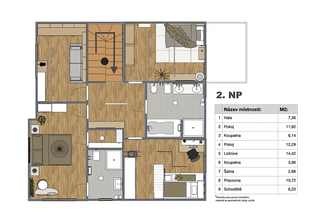 ložnici s vlastní koupelnou, sprchovým koutem a šatnou, dva dětské pokoje / pracovny, další koupelnu s vanou i sprchovým koutem, samostatnou pracovnu a centrální chodbu.
