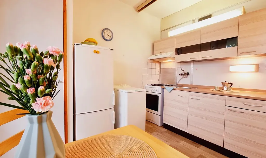 Kuchyně (10 m²) je zařízena kuchyňskou linkou s plynovým sporákem a troubou, kombinovanou lednicí, pračkou, spížovou skříní a jídelním stolem s židlemi.
