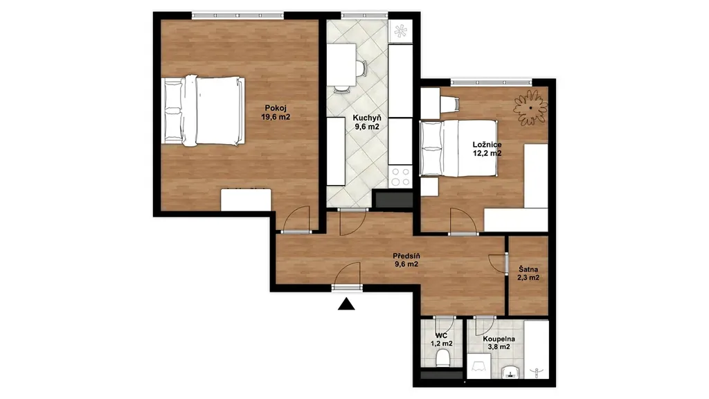 Dispozičně je řešen velmi prakticky – z předsíně s vestavěnou skříní a komorou se vstupuje do obývacího pokoje, ložnice, kuchyně s jídelním koutem, nové vyzděné koupelny a samostatného WC. Okna bytu jsou orientována na jih a poskytují klidný výhled do soukromé zahrady, která je součástí prodeje. V přízemí domu je k dispozici společná kolárna, kočárkárna a sklepní prostory.