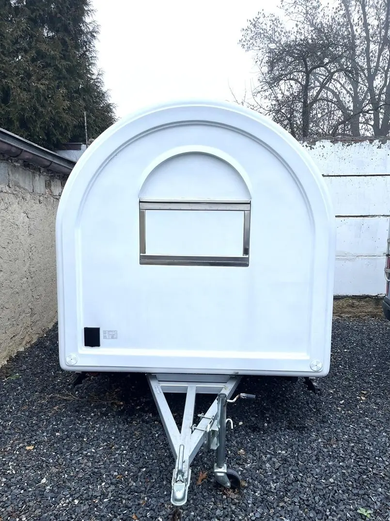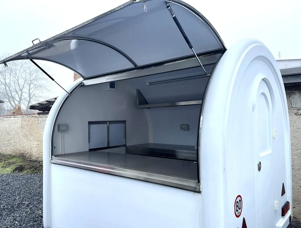 Nabízíme k prodeji zánovní Food Truck, k užívání jako pojízdná kavárna, pojízdný stánek s občerstvením. Stánek má plechové opláštění s rozměry 230/ 200/ 200, a elektrické připojení 230/380 V. Vybaven je nerezovými stoly z obou stran a umyvadlem s baterií. Barva opláštění je bílá a lze ho transportovat za autem s připojením tažného zařízení. Pro více informací prosím o osobní kontakt.