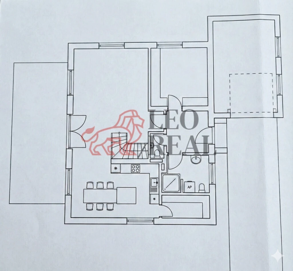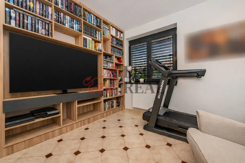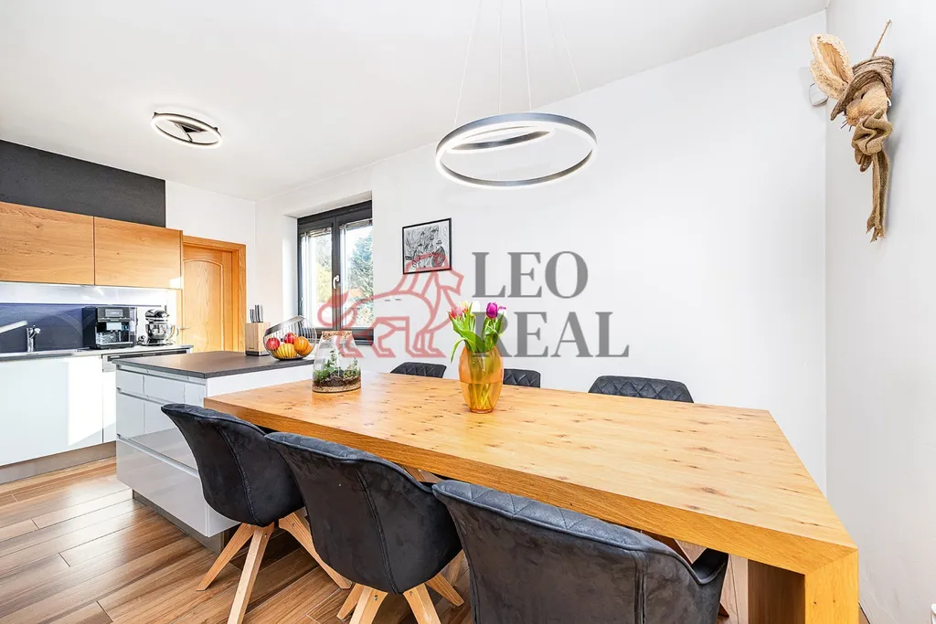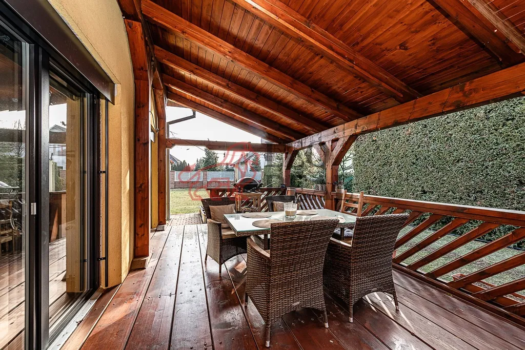 • Přízemí: Srdcem domu je obývací pokoj (26,7 m²) propojený s kuchyní (15 m²) a jídelnou, kde dominuje masivní dubový stůl. Odtud vede vstup na zastřešenou terasu, která plynule propojuje dům se zahradou a nabízí soukromí pro relaxaci za každého počasí. Dále se v přízemí nachází pracovna s vestavěnou knihovnou (ideální pro home office), koupelna se sprchovým koutem, pračkou a sušičkou, spíž a garáž (19,45 m²).