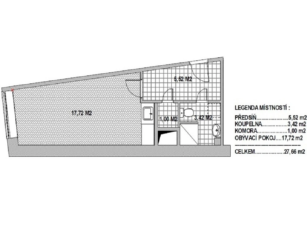 Dispozice: pokoj s kuchyňským koutem o ploše 18,65 m², prostorná předsíň 4,15 m², komora/šatna 1 m², koupelna se sprchovým koutem společná s WC 3,85 m².