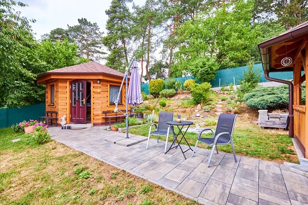 Zadní část pozemku tvoří relaxační zóna. Na malém kopečku mezi vzrostlými stromy stojí dvě kruhové dřevostavby. První slouží jako zázemí pro odpočinek s kuchyňkou, toaletou a venkovní sprchou, ve druhé si posedíte, zagrilujete a úplně vypnete.