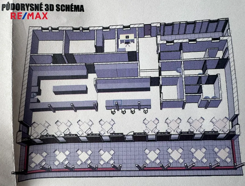 Co se týká prostoru restaurace, ta má plochu 61,55m2, kuchyně 27,32m2, bar 16,10m2, sklad 4,84m2, spíž 6,88m2, úklid 3,17m2, dále chodby a WC samostatně pro ženy, muže, personál a ZTP. Další místnosti jsou kancelář, sprcha, technická místnost, šatny a sklady. Zahrádka má rozlohu 53,04m2. Celková plocha těchto prostor je 262,43m2. Za objektem je možno ještě stavět na ploše 100m2.