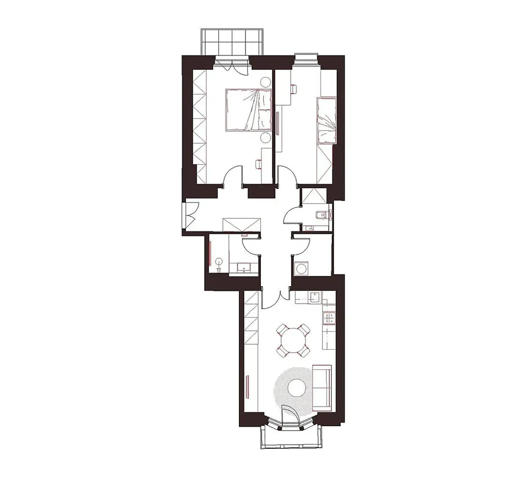 Půdorys bytu ve 3. podlaží zahrnuje velkorysý obývací pokoj s přípravou na kuchyň, dvě samostatné ložnice, prostornou vstupní chodbu, praktickou šatnu, koupelnu a toaletu. K jednotce náleží také balkon a sklepní kóje. Vybavení zahrnuje dubové podlahy, dřevěná špaletová okna s dvojsklem, elegantní interiérové dveře, koupelnu s mramorovými obklady se sanitou značek Laufen a Grohe a decentně řešená otopná tělesa a elektroinstalaci, která neruší celkový výraz interiéru. Byt bude dokončen v provedení fit out – připravený k okamžitému nastěhování.