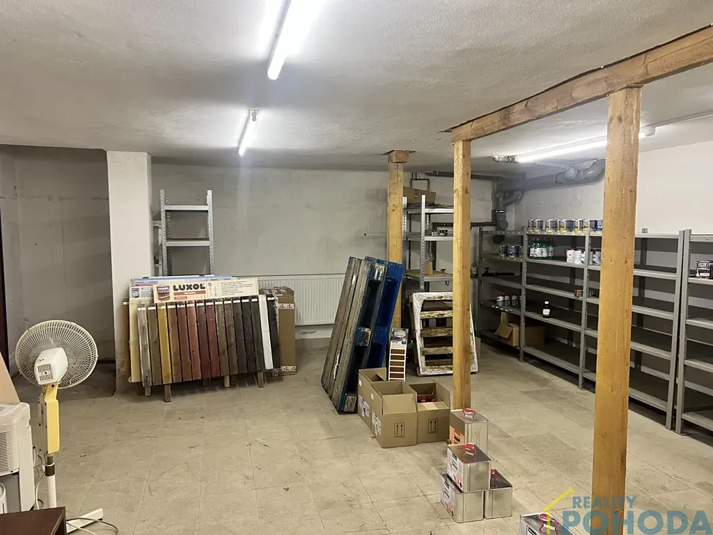 Součástí obchodu je kuchyňka, toaleta (zázemí cca 12 m2) a chodba se schodištěm a výtahem do suterénu, kde se nachází skladovací prostory s možností vytápění.