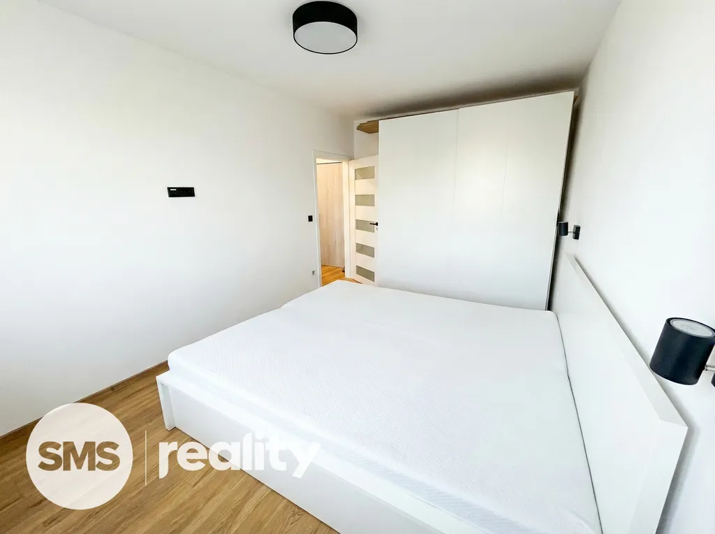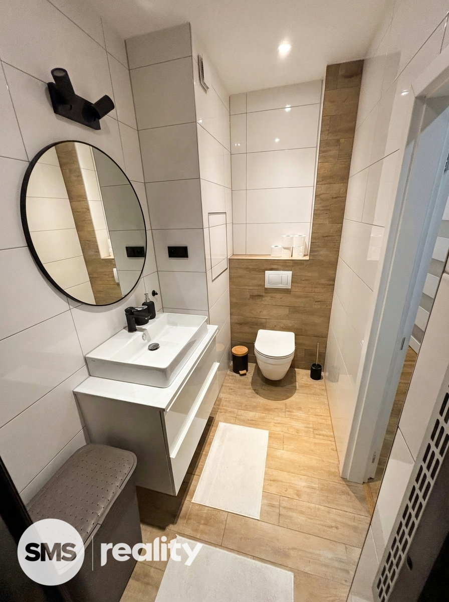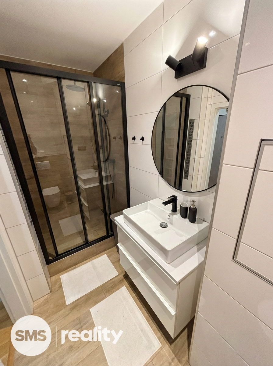 Dispozice bytu je velmi praktická a zahrnuje vstupní chodbu, samostatnou ložnici, obývací pokoj s kuchyňským koutem a koupelnu s toaletou. Obývací část je vybavena prostornou sedací soupravou, konferenčními stolky a TV skříňkou, což vytváří příjemný prostor pro relaxaci i návštěvy. Kuchyňský kout je součástí obývacího pokoje a poskytuje dostatek místa pro každodenní vaření a stolování. Ložnice je zařízena manželskou postelí, nočními stolky a úložnými prostory. Koupelna je moderně řešena se sprchovým koutem, umyvadlem se skříňkou a toaletou, vše v elegantní kombinaci bílé barvy a dřeva.