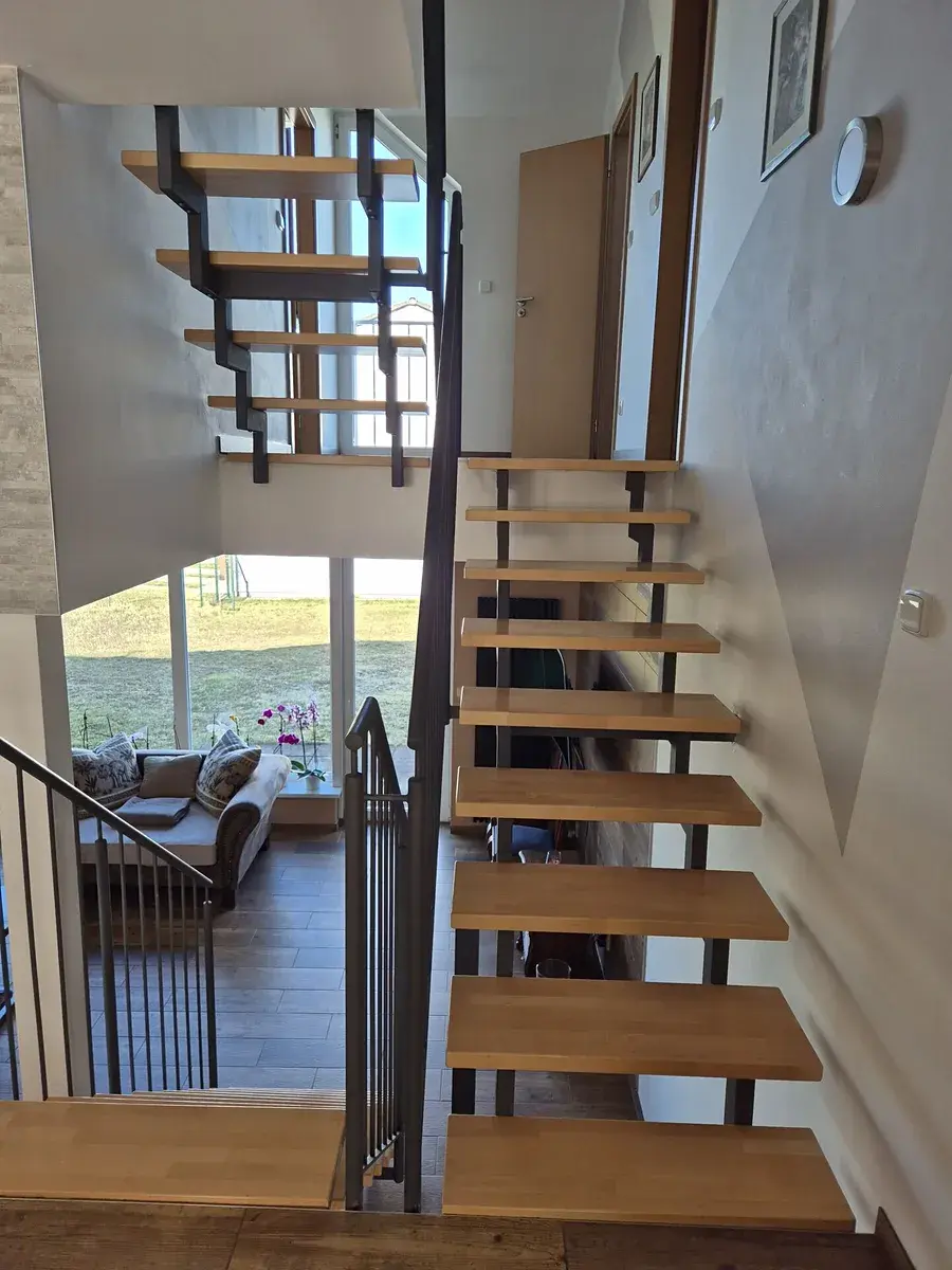 Dispozice domu - v přízemí se nachází obývací pokoj (5,00x6,60m) se vstupem na zahradu, v 1NP je umístěn hlavní vchod do domu, chodba s vestavěnými skříněmi, kuchyň (3,15x5,00m) vybavená kuchyňskou linkou (lednicí s mrazákem, digestoří, myčkou nádobí, horkovzdušnou troubou, indukční deskou, granitovým dřezem), samostatné wc (umyvadlo, úpravna vody) a komora (nyní je zde umístěna aut. pračka a úložné regály). Ve 2NP je koupelna s umyvadlem a sprchovým koutem, další samostatné wc (vestavěné skříně, je zde umístěn plynový kotel a ohřev vody), pokoj s francouzským oknem (4,10x4,60m). Ve 3NP se nachází ložnice (4,30x2,80m) s velkým úložným prostorem, vestavěnou skříní a obytným patrem (1,20x2,00m), další pokoj s vestavěnou skříní (4,20x3,02m) s úložnými prostorami a obytným patrem (4,20x1,20m). Na podlaze v celém domě jsou kvalitní dlažby a vinyl, v koupelně a na wc keramické obklady a dlažba, vytápění plynovým kotlem zn. Baxi, v domě jsou topná tělesa (panely).