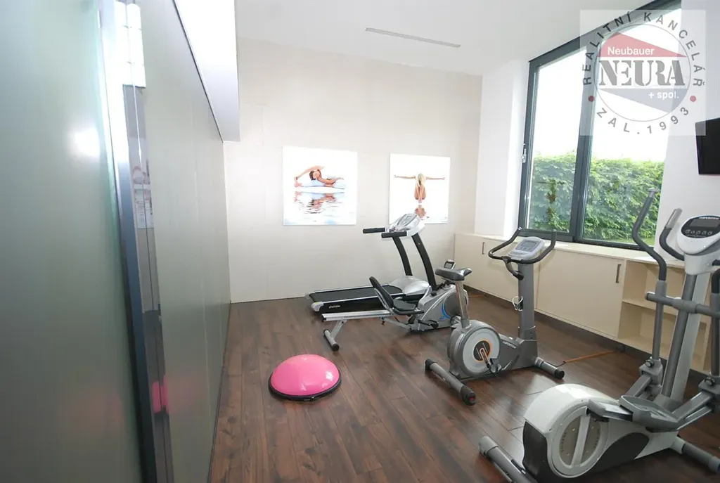 hliníková okna s izolačním dvojsklem a venkovními roletami, bezpečnostní vstupní dveře, dřevěná plovoucí podlaha a dlažby, kuchyňská linka, koupelna s vanou, teplovodní vytápění s rozvody ÚT, ohřev vody centrální, centrální klimatizace, částečně zařízeno,