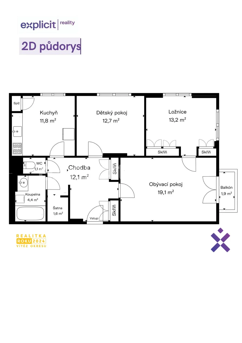 Komfort bydlení podtrhuje oddělená koupelna s vanou a samostatná toaleta, což je praktické řešení pro každodenní fungování domácnosti. V bytě vás mile překvapí i prostorná chodba, kde se pohodlně vejdou skříně, botník i další úložné řešení, které v běžných bytech často chybí. Součástí bytu je také balkon, který příjemně rozšíří prostor hlavně v teplejších měsících, a k dispozici je i sklepní kóje o velikosti cca 2 m², ideální na sezonní věci nebo sportovní vybavení.