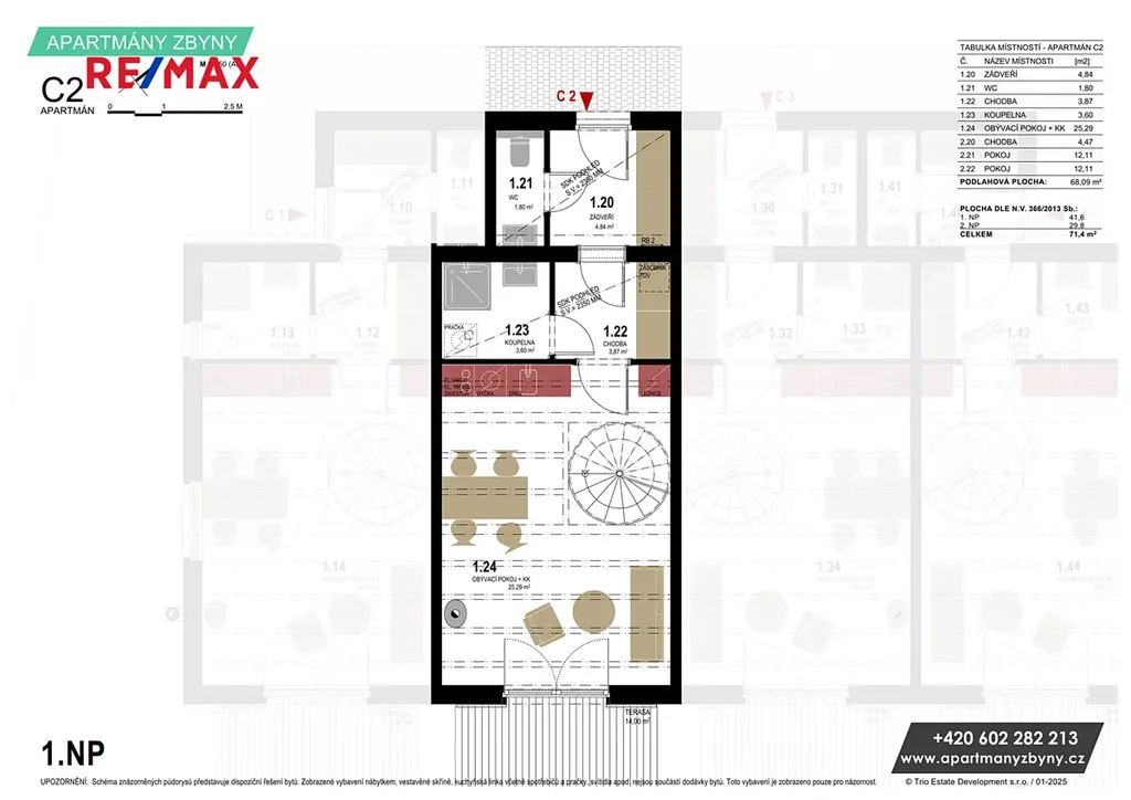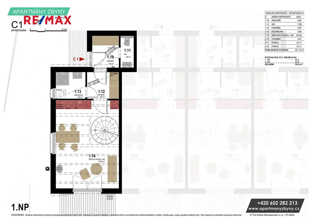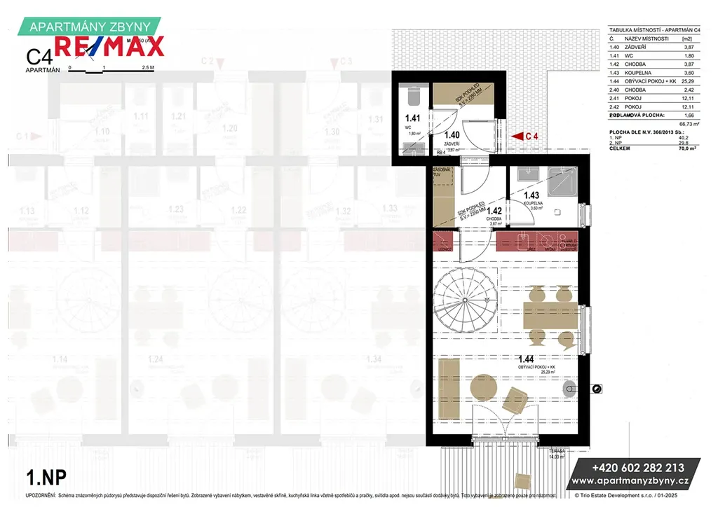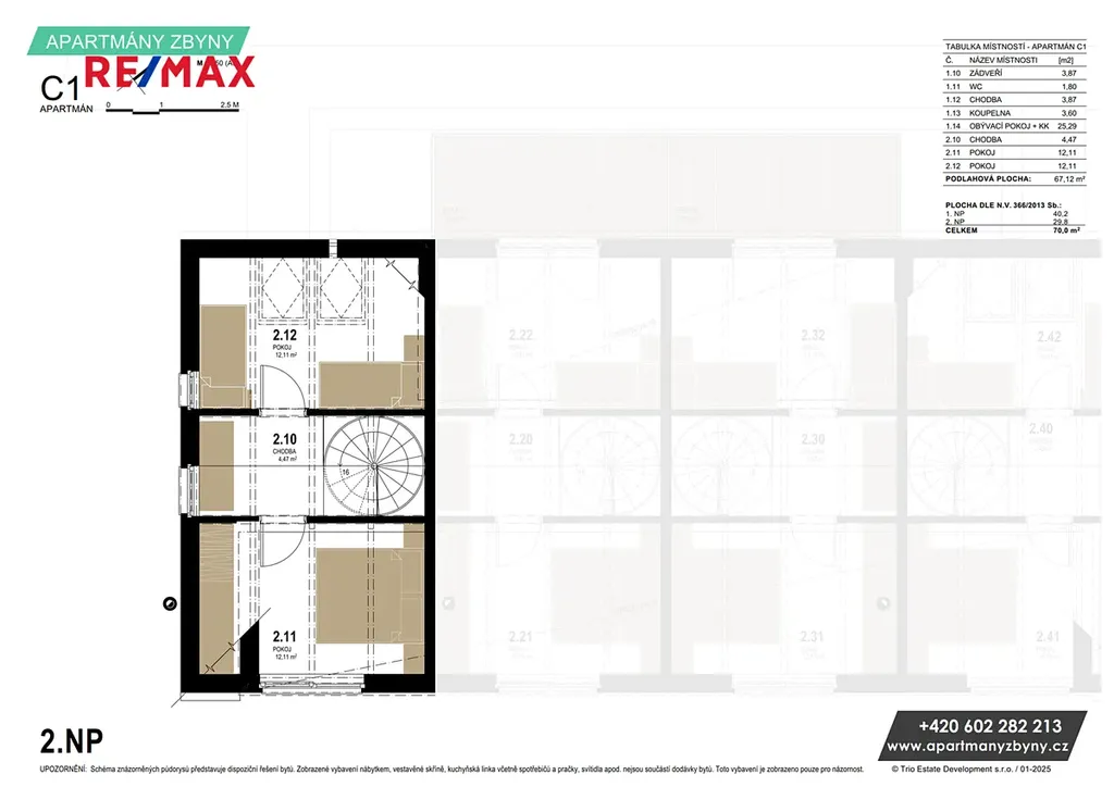 • Všechny bytové jednotky jsou mezonetové; dvě z nich jsou rozšířeny o střešní terasu 8.3 m²