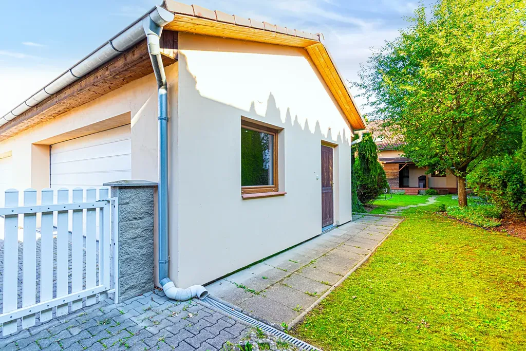 Za domem je velkorysá garáž pro dvě auta. Při příjezdu nemusíte vystupovat z auta díky dálkově ovládanému režimu rychlého otevření a automatického zavírání vrat.