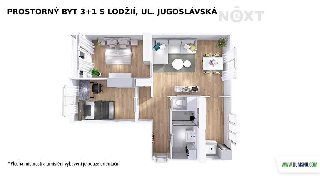 Z předsíně, která disponuje úložným prostorem, je vstup do koupelny, na samostatné WC, do pokoje a do velkého obývacího pokoje, ze kterého se dále prochází do ložnice či kuchyně. Ta je vybavena na míru vyrobenou kuchyňskou linkou s vestavěnou troubou, varnou deskou a myčkou. V koupelně najdete nadstandardní sprchový kout, umyvadlovou skříňku se zrcadlem a prostor pro pračku a sušičku. Byt dále nabízí dva samostatné pokoje, z nichž jeden má přímý vstup na lodžii s výhledem na klidnou část sídliště.