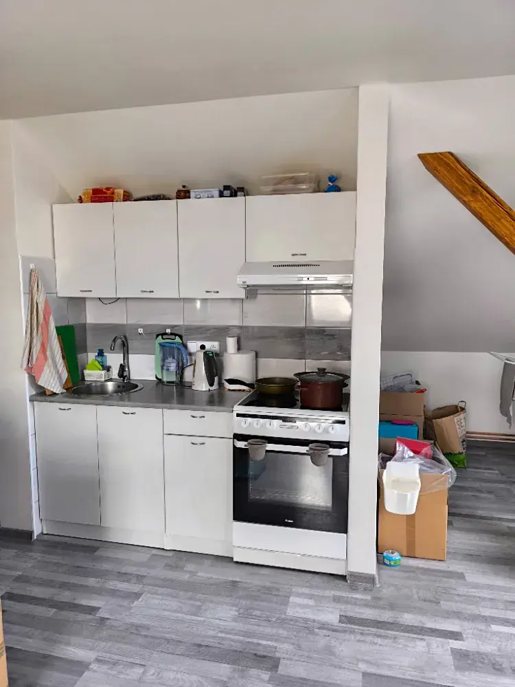 Nabízíme k prodeji novostavbu podkrovního bytu o dispozici 2+kk o podlahové ploše 69 m², který se nachází ve 2. patře bytového domu. Byt prošel kolaudací v roce 2021 a představuje tak moderní bydlení se zárukou kvality a nízkých provozních nákladů. Tato bytová jednotka byla navržena s důrazem na vysokou energetickou efektivitu a akustický komfort. Stěny i podlahy disponují nadstandardní 30cm izolací z vaty. Podlahy jsou tvořeny tlumicí kročejovou izolací (20mm), mirelonem a plovoucí podlahou, položenou na latích a dvou vrstvách OSB desek (25 mm). K dobré izolaci přispívají také třískelná střešní okna. Vstupní zeď do bytu tvoří masivní 30cm Ytong. Příčky v bytě jsou sádrokartonové. Bezpečnost zajišťují protipožární kovové vstupní dveře. Vytápění je řešeno elektrokotlem s radiátory, který je možné doplnit krbovými kamny. Do domu je zaveden také plyn. Pravidelné měsíční náklady - fond oprav 1000,-Kč/měs., zálohy na elektřinu 3700,-Kč/měs., voda1000,-Kč/měs. Dům je po částečné revitalizaci. Byly vybudovány nové odpadní stoupačky. V roce 2020 byla udělána nová střecha s betonovou taškou, novými svody a kominickou lávkou. Společenství vlastníků má v dohledném časovém horizontu v plánu zateplení fasády celého bytového domu. K bytu náleží prostorný sklep o velikosti 8–10 m². Velkou výhodou je možnost užívání pozemku u domu (zahrady). Pro bezproblémový příjem signálu je k dispozici společná TV anténa (pro 3 byty) a internet O2/pevná linka. Parkování je komfortně vyřešeno, k dispozici jsou až 4 parkovací místa přímo u domu. Schodiště do patra je kovové s dřevěnými nášlapy. Město Hořovice disponuje veškerou občanskou vybaveností. Výborná dostupnost dálnice D5 (Praha - Plzeň) - exit 34 - 3km.