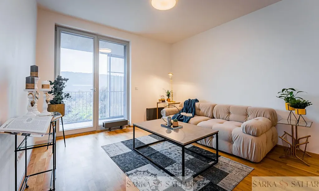 Exkluzivně vám nabízíme na pronájem slunný byt 2+kk 58m2 plus lodžie 15m2, garážové stání a sklep v 4.NP moderní nové Residence Zahálka, Mezi Vodami 47.