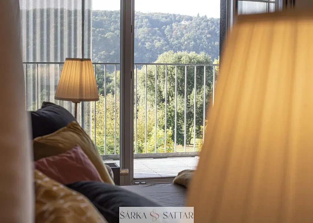Obě obytné místnosti mají přímý vstup na krásnou lodžii s výhledem do zeleně golfového hřiště Hodkovičky.