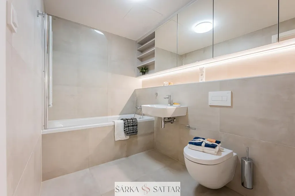 Tento vzdušný, nový byt s výhledem na zeleň golfového hřiště je umístěn v krásné lokalitě Hodkoviček.
