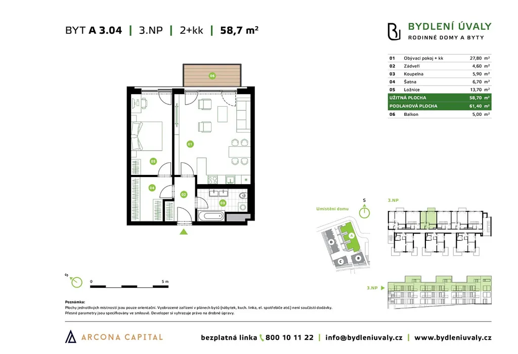 Byt je součástí čtvrté etapy Bydlení Úvaly, která přirozeně navazuje na předchozí dokončené etapy a stávající zástavbu a doplňuje tak dnešní Úvaly v jejich charakteru příjemného a obytného městečka. Celkově do prodeje míří 39 bytů s dispozicemi 1+kk až 5+kk ve dvou bytových domech. Dále jde o čtveřici velkorysých mezonetových třípodlažních bytů 3+kk, každý se samostatným vchodem přímo z ulice, garáží a prostornými terasami ve více podlažích. Aktuální nabídku uzavírá pět rodinných domů v dispozicích 3+kk nebo 4+kk, vždy s vlastní zahradou a předzahrádkou.