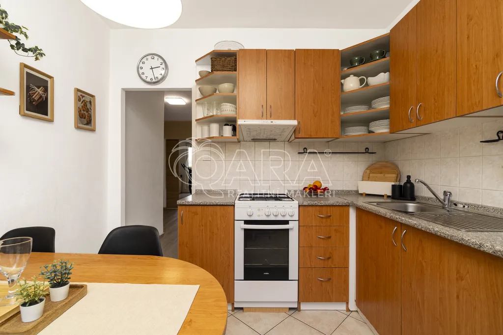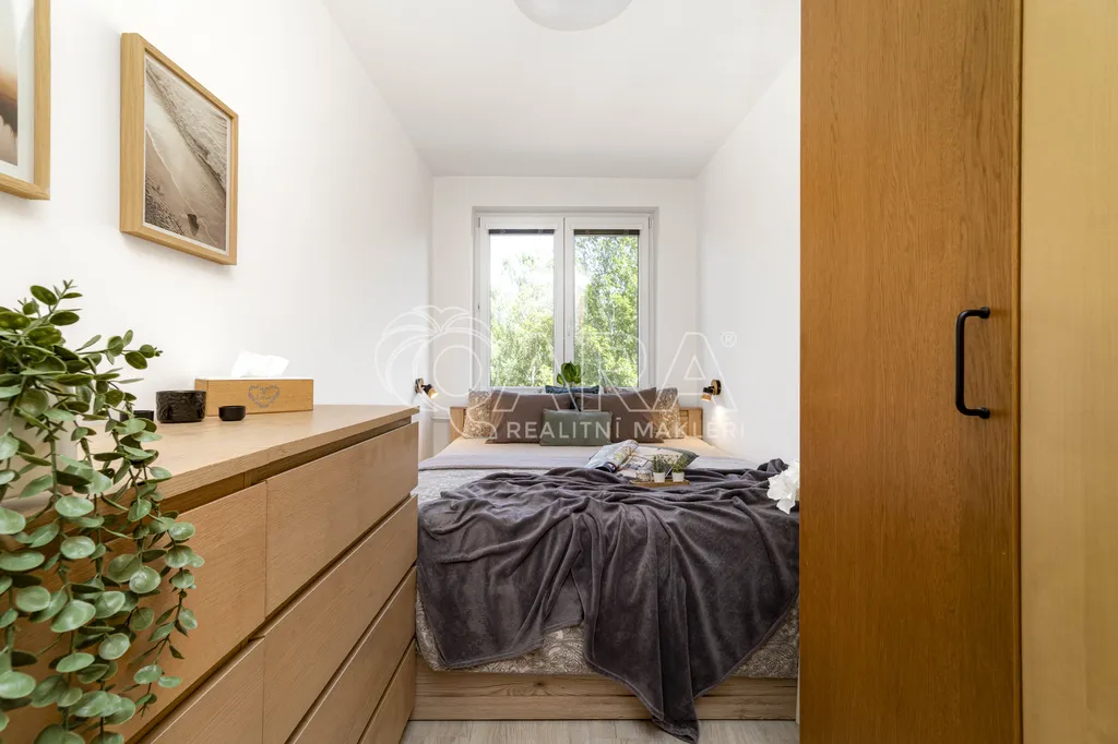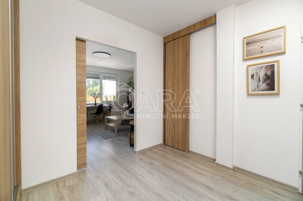 Byt má praktické dispoziční řešení: tři neprůchozí pokoje, světlý obývací prostor s posuvnými dveřmi, kuchyni, koupelnu a WC odděleně a také kumbál, který skvěle poslouží jako další úložný prostor. Zasklená lodžie je ideální pro relax nebo dětský koutek. Byt se prodává včetně zařízení (nebo po domluvě), stačí se jen nastěhovat. Dále bych vyzdvihl bezproblémové parkování před domem, které se už moc často nevidí.