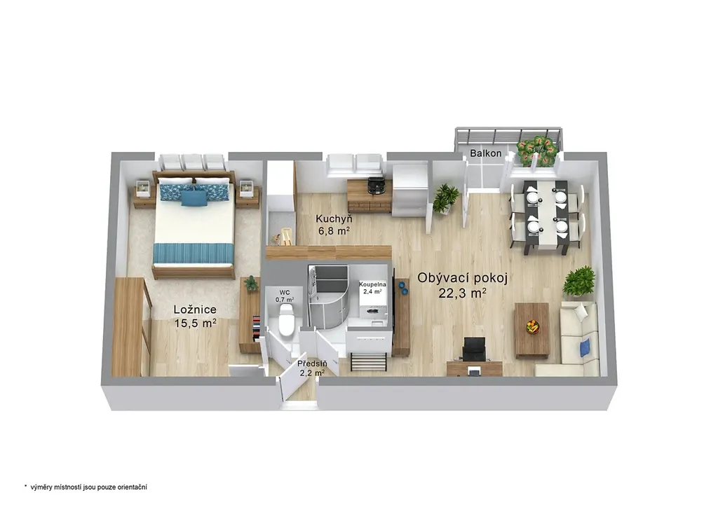 Byt o dispozici 2+kk s celkovou plochou 51 m² se nachází v 5. nadzemním podlaží cihlového domu po revitalizaci. Součástí bytu je obývací pokoj s výstupem na balkon orientovaný na jih, kuchyňská část a samostatný pokoj sloužící jako ložnice. K dispozici je také koupelna a samostatné WC.