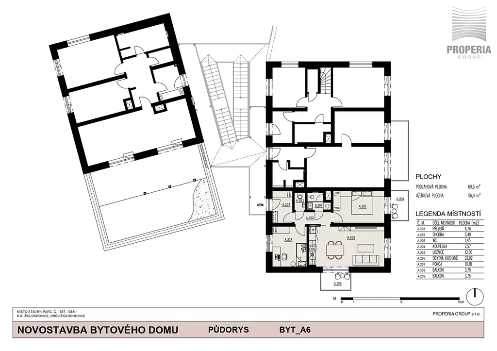 • Plocha: Podlahová plocha 60,5 m² (užitná plocha 56,4 m²).