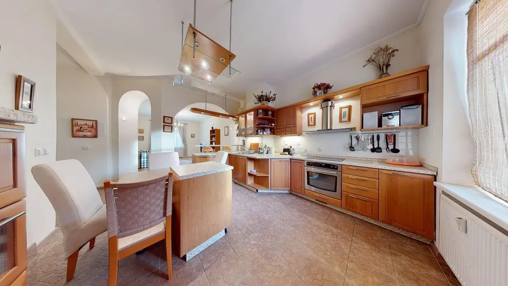Oddělená kuchyně se stylovým barovým pultem, který ji propojuje s obývacím pokojem