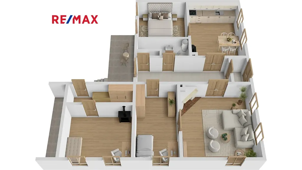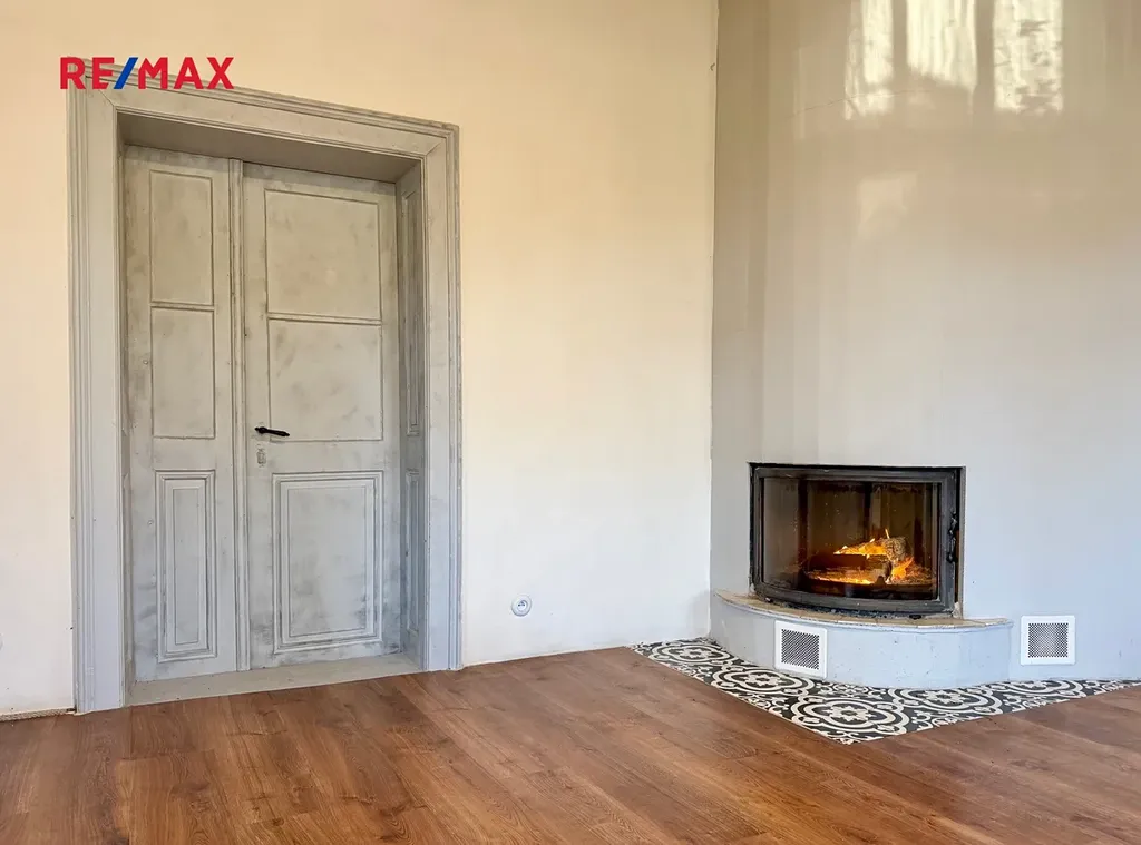 Obývací pokoj s přiznanými trámy a krbem je svatyní klidu. Představte si podzimní večery s knihou u ohně nebo dlouhé hovory s přáteli pod masivními stropy, které pamatují příběhy generací, ale díky rekonstrukci září novotou.
