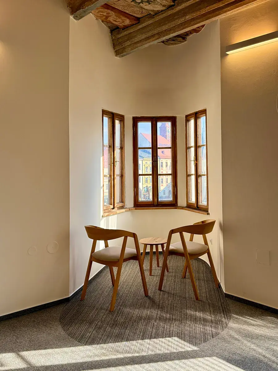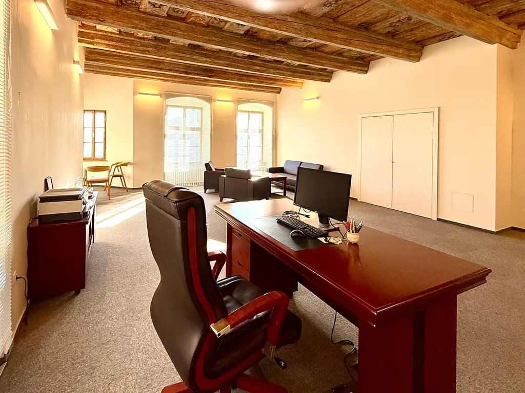 Nabízíme k pronájmu reprezentativní kancelář s renesančním stropem ve II. patře domu na nároží Masarykova náměstí a ulice Komenského. Jedná se o nebytový prostor o výměře 61,2 m2 v zabezpečeném a hlídaném objektu. V kanceláři, která byla zcela zrekonstruována a zmodernizována jsou připraveny rozvody počítačových sítí a telefonu, je zde vlastní vybavená kuchyňka a v případě zájmu lze odkoupit nábytek (viz. foto). K dispozici je zcela nové sociální zařízení a další kuchyňka na mezipatře domu. V rekonstruované budově sídlí významné obchodní společnosti. Dům tvoří horní (severní) "uliční frontu" centrálního jihlavského náměstí, kde kromě jiných naleznete Českou spořitelnu, Českou poštu, Innogy a další. Prostor je volný od 1.4.2026 a inzerovaná cena neobsahuje DPH a platby spojené s provozem činí cca 7.200 Kč. Hodnoty PENB nejsou udány, protože měšťanský dům "U Svaté trojice" je zapsán v seznamu nemovitých památek.