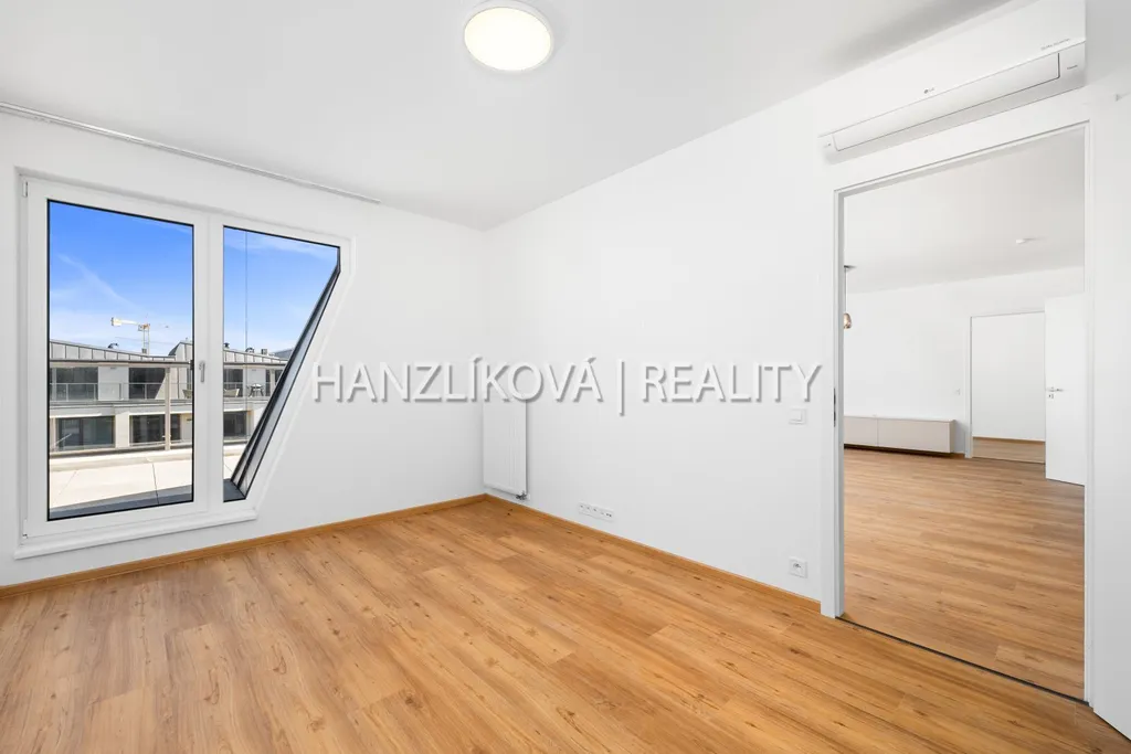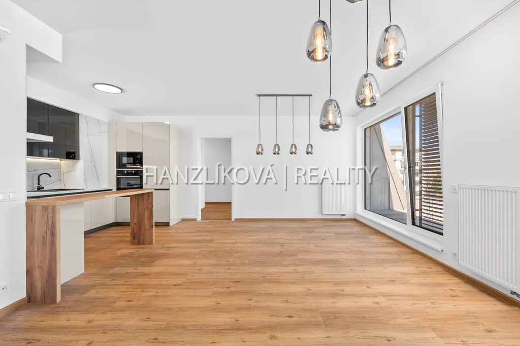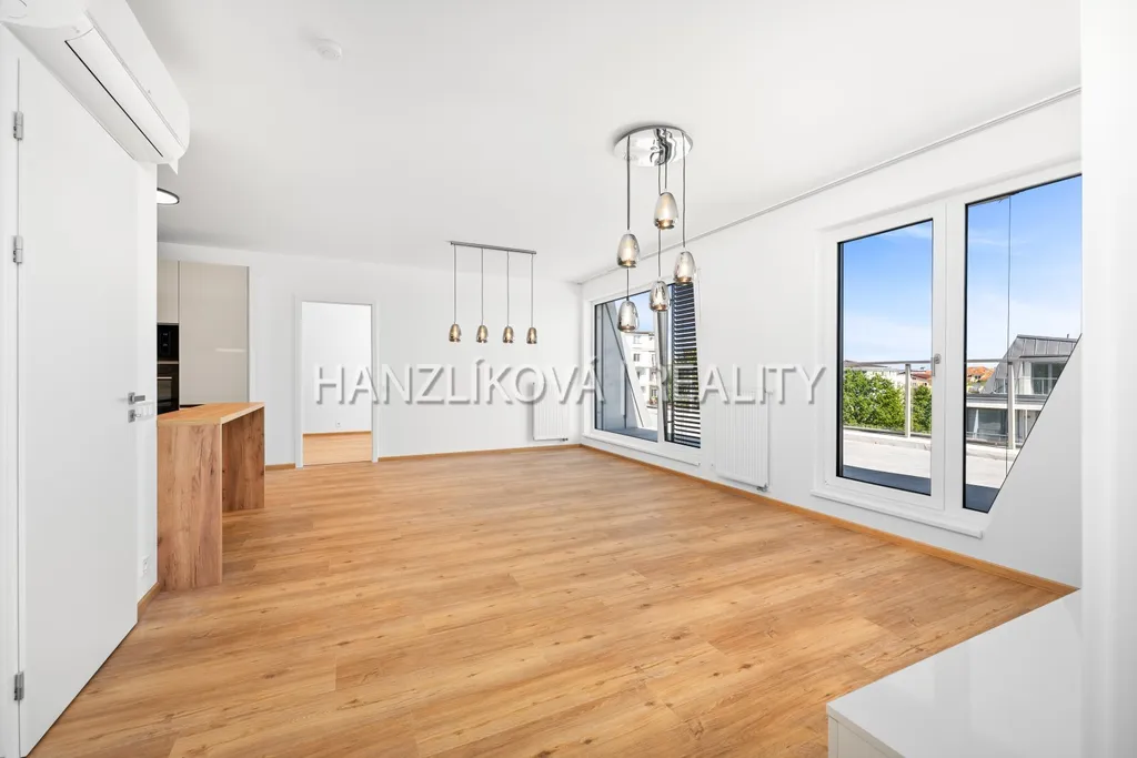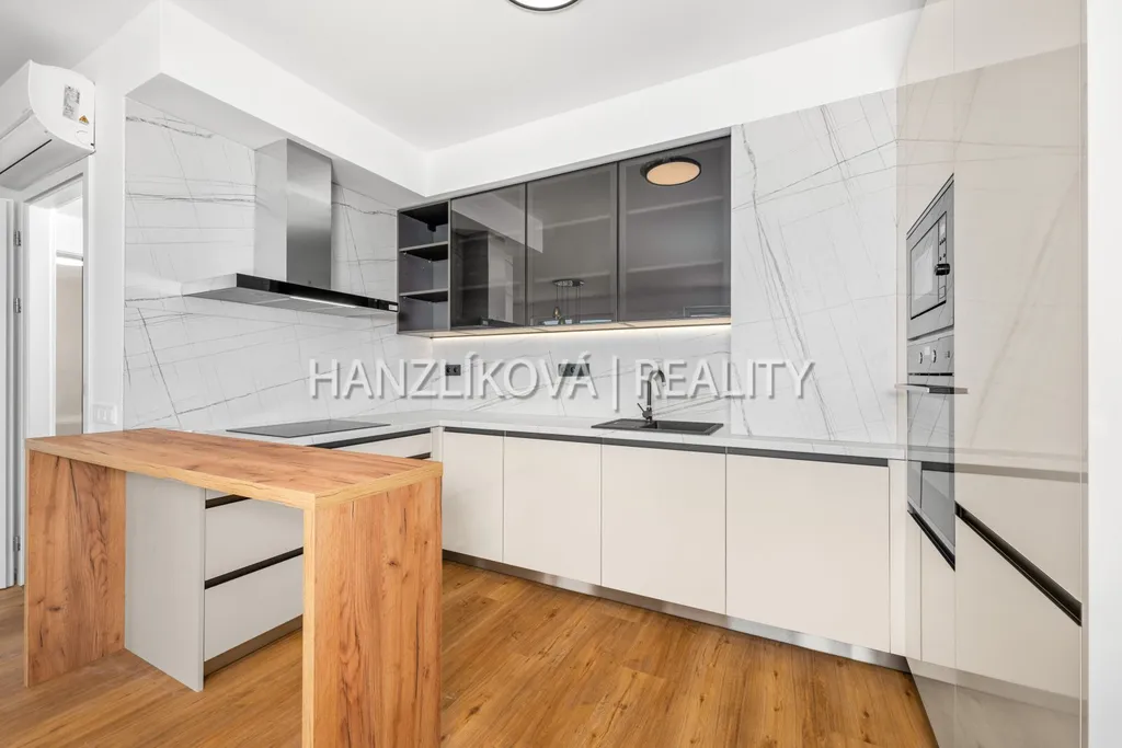 Byt je částečně vybaven - kuchyňská linka na míru od kuchyňského studia Hanák včetně značkových elektrospotřebičů, barový pult, osvětlení ve všech místnostech, klimatizační jednotky, předsíňová stěna, předokenní venkovní žaluzie.