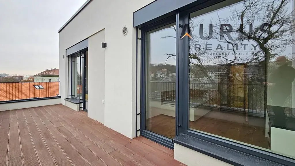 Byt je dispozičně řešen jako 4+kk, nachází se ve 4. podlaží, čistá obytná plocha 123,5 m2 + dvě regulérní ničím nestíněné terasy 12m2 a 14,4 m2. K dispozici jsou, kromě velkého obývacího pokoje s kuchyňským koutem a vstupem na jižní terasu, tři samostatné ložnice, z toho dvě s přístupem na terasu severovýchodní, dvě prostorné koupelny, jedna se sprchovým koutem a toaletou a druhá s vanou, dvěma umyvadly a toaletou. Dále je v bytě samostatná místnost pro praní, sušení a uložení prádla a samostatná toaleta, také je k dispozici velké garážové stání a velký sklep 5,6 m2. Je možné si pronajmout ještě druhé velké parkovací stání vedle. Byt je částečně zařízený novým vybavením, které je vidět na fotografiích.