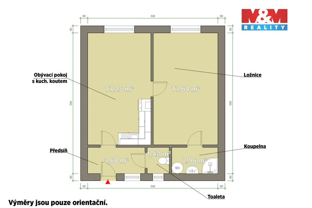 Dispozice bytu je velmi dobře využitá – vstupní předsíň, obývací pokoj s kuchyňským koutem, samostatná prostorná ložnice, koupelna a oddělená toaleta. Díky dvěma téměř stejně velkým pokojům nabízí byt komfortní bydlení i zajímavý potenciál pro investiční využití. Byt je prodáván částečně zařízený.