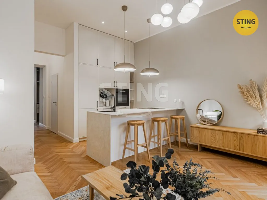 Byt prošel zdařilou rekonstrukcí s důrazem na funkčnost a nadčasový design. Velkorysý obytný prostor je přirozeně propojen barovým ostrůvkem s kuchyňským koutem.