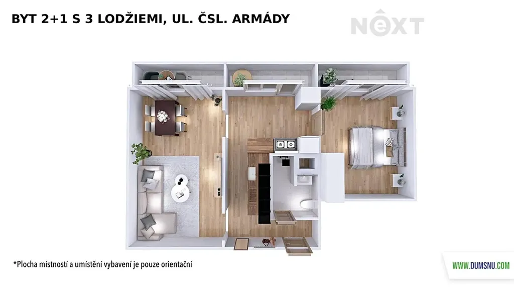 Velkou předností jsou tři prostorné lodžie, které výrazně rozšiřují užitnou hodnotu bytu. Nabízejí prostor pro posezení, relaxaci, ale i praktické využití, například pro sušení prádla nebo pěstování bylinek.