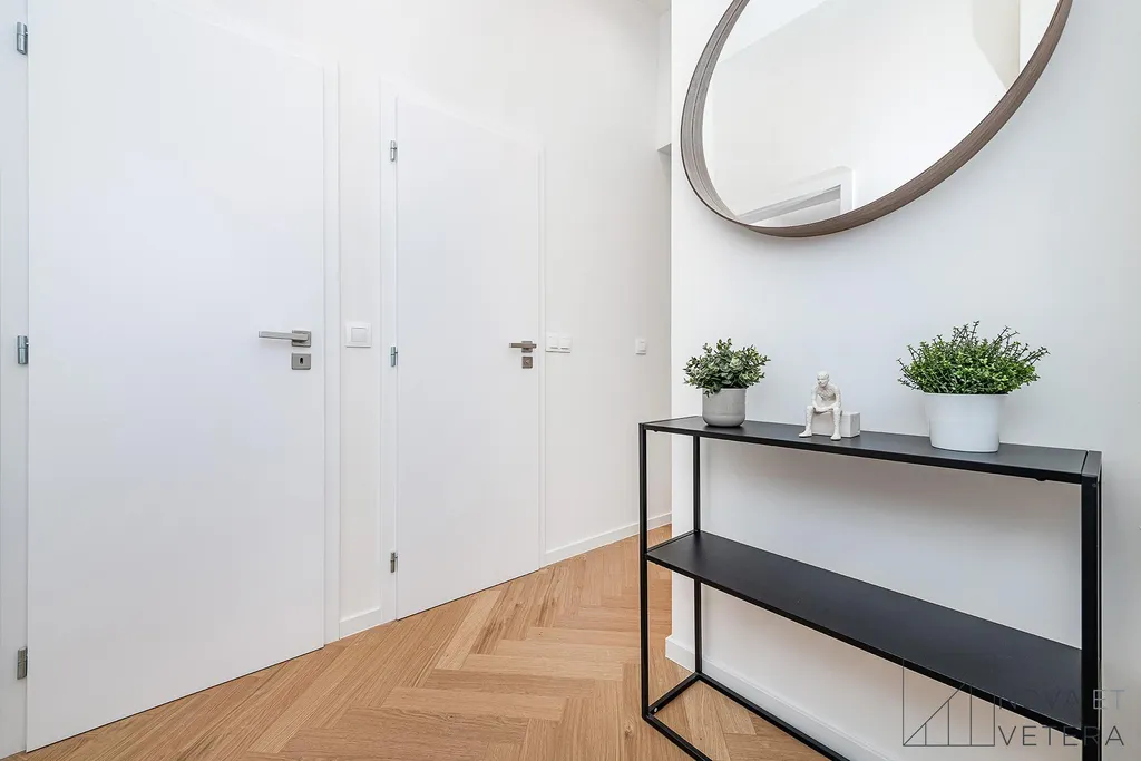 Byt právě prošel kompletní rekonstrukcí, která zahrnovala nové rozvody elektřiny, vody a odpadů, moderní podlahové krytiny, okna, nové obklady a sanitu.Součástí vybavení je kuchyňská linka na míru se spotřebiči prémiové značky Bosch.