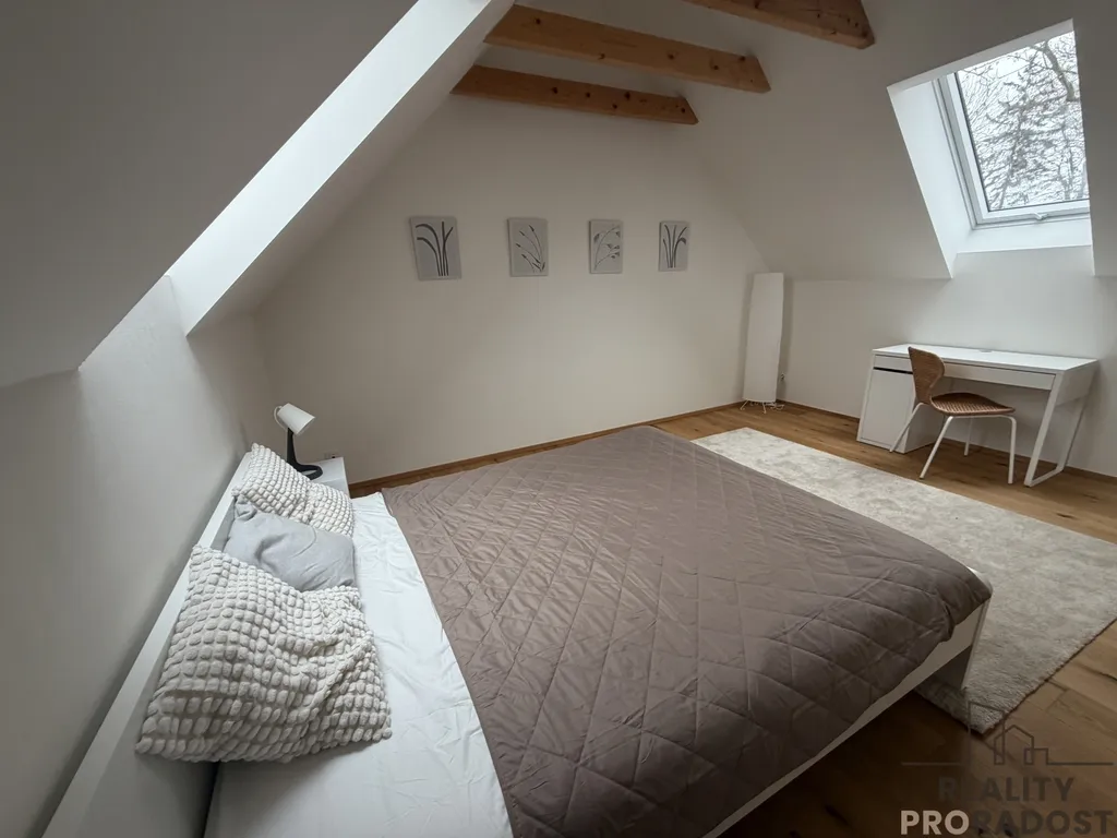 Podkroví (Noční část): Po schodech vystoupáte do klidové zóny, kde naleznete hlavní ložnici rodičů, druhý dětský pokoj a druhou koupelnu, což zajišťuje maximální komfort pro vícečlennou rodinu během ranní špičky.