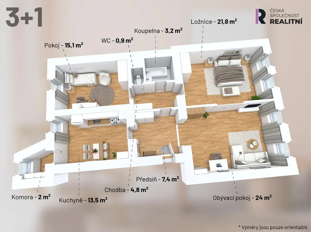 Tento byt se současnou dispozicí 3+1 o užitné ploše 93 m² (podlahová plocha 100 m²) je přesně tou příležitostí, která se na trhu objevuje jen výjimečně.