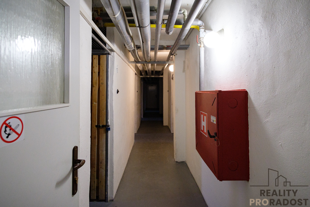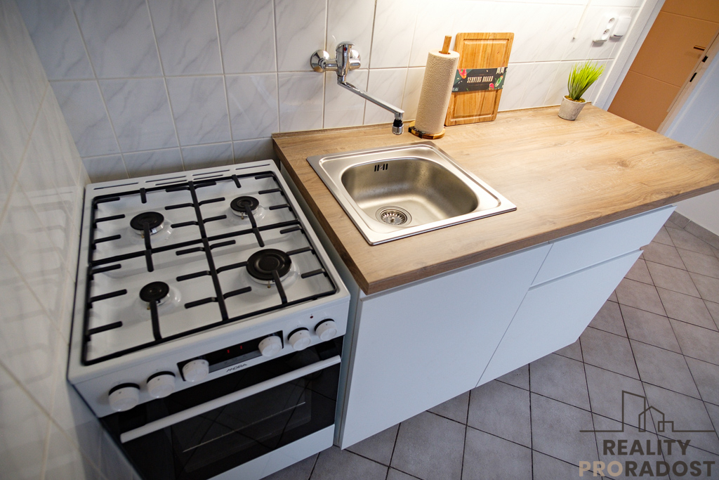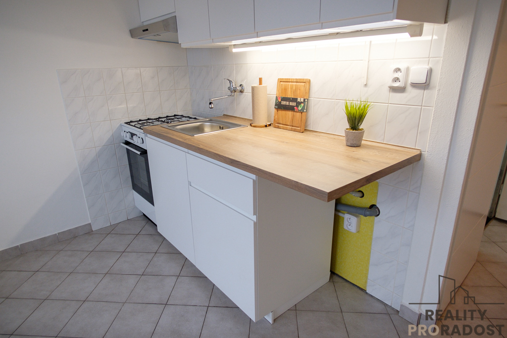 Byt je prázdný, vybavený zcela novou kuchyňskou linkou a kombinovaným sporákem (plynové hořáky + elektrická trouba), s připraveným místem na umístění pračky. V kuchyni je dále k dispozici prostorná spižní skříň. Koupelna je průchozí na WC, vybavena je sprchovým koutem a umývadlem se skříňkou a jsou zde 2 zrcadla. Další zrcadlo je spolu s věšákovou stěnou umístěno ve vstupní chodbě (viz foto). V bytě jsou plastová okna, nové dveře do pokoje a kuchyně, podlahy v pokoji parkety, v ostatních místnostech je keramická dlažba. Bytové jádro je částečně obložené keramickými obklady. Topení a ohřev vody je zajištěno dálkově. Dispozice viz orientační plánek.