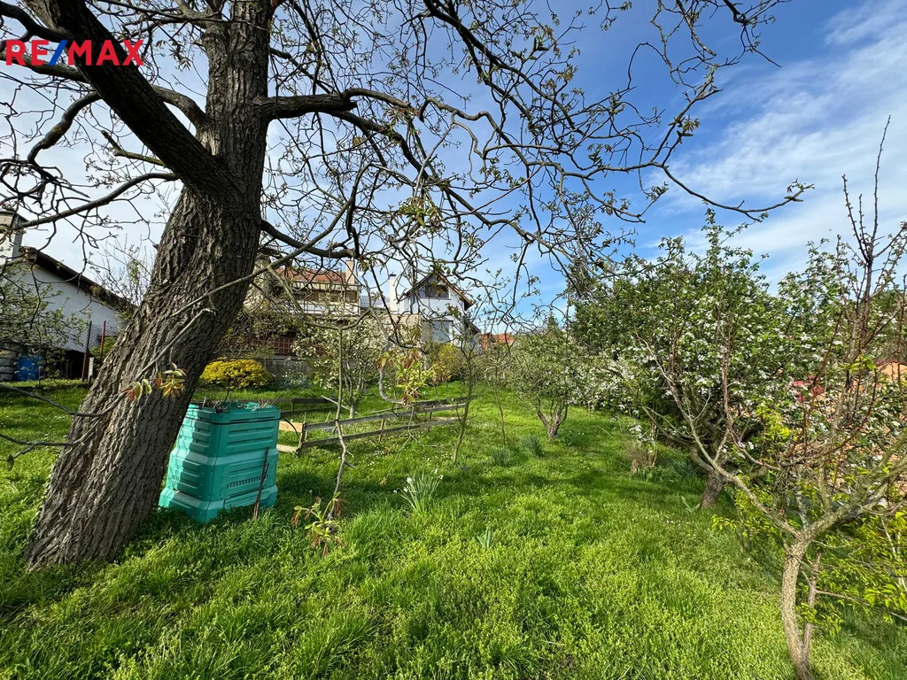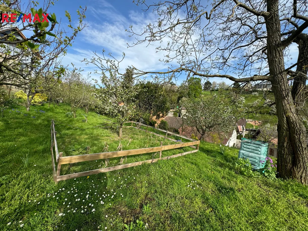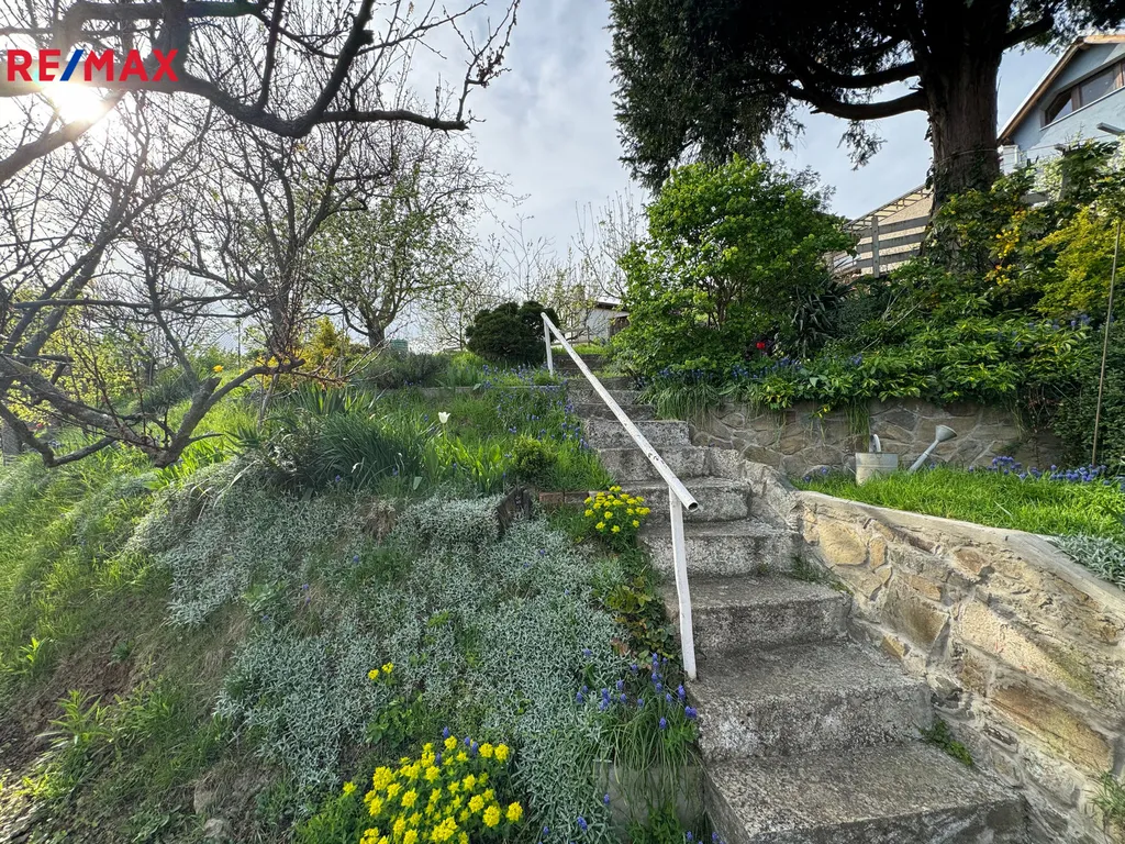 Z horní části zahrady je nádherný výhled do okolí. Na zahradě jsou ovocné stromy, okrasné keře a další okrasné květiny.