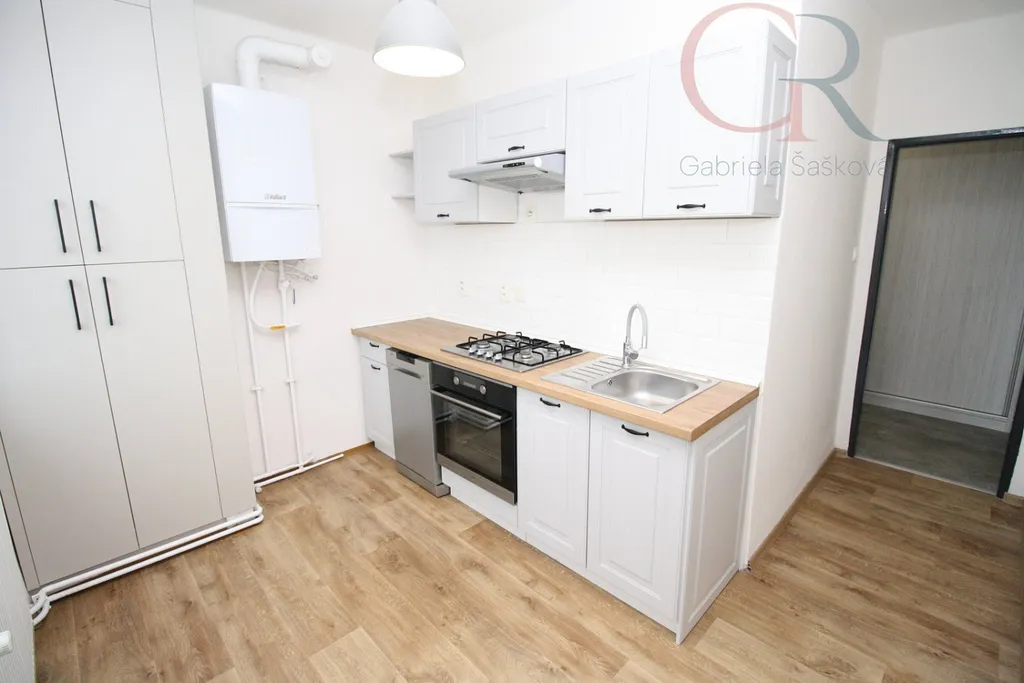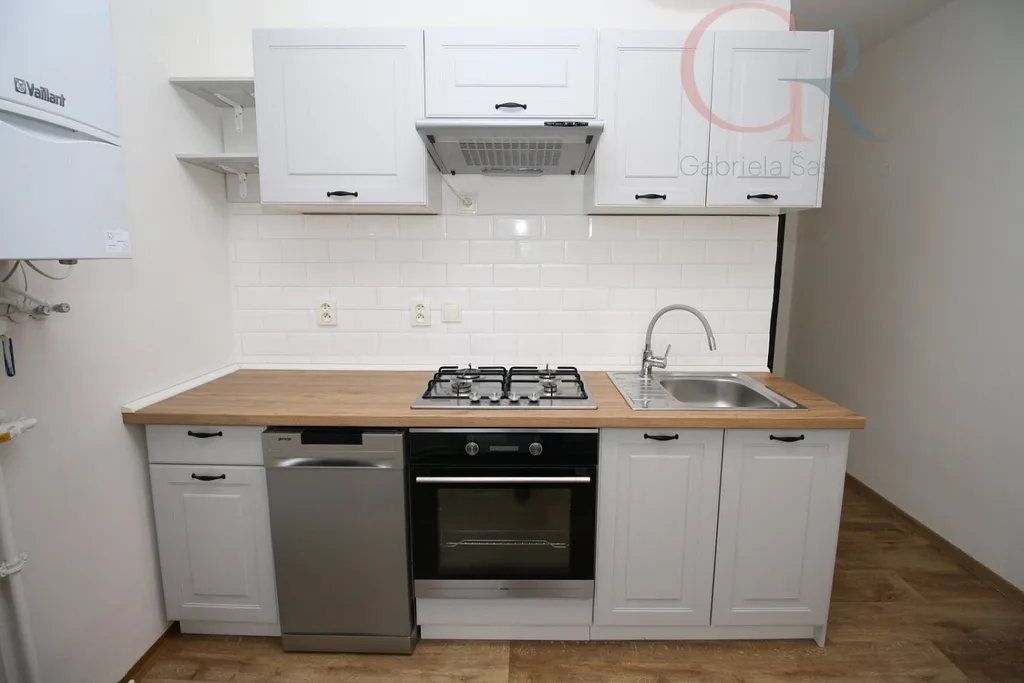 Kuchyňská linka disponuje vestavěnými spotřebiči - plynovou varnou deskou, elektrickou troubou a myčkou.