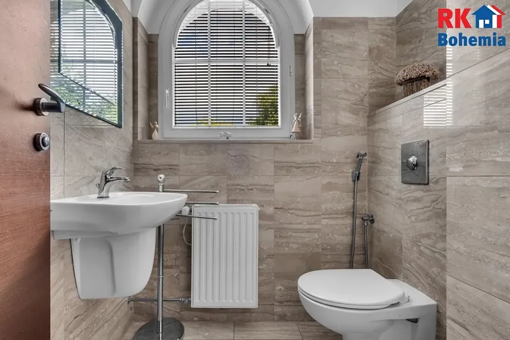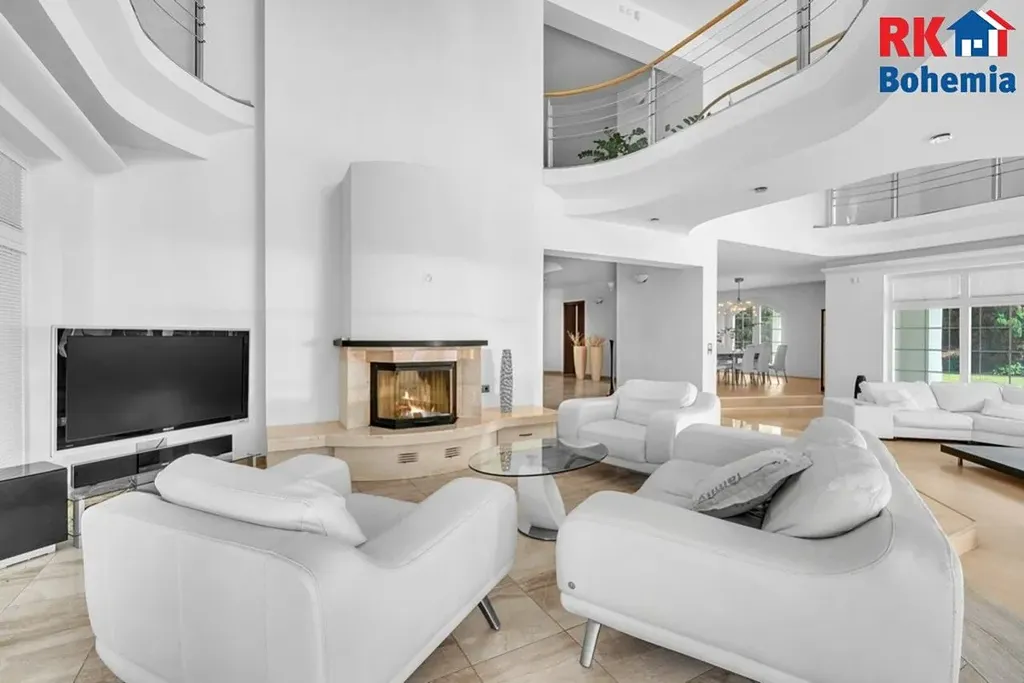 Bonusem je velmi citlivě upravená zahrada ze zavlažováním, se vzrostlými stromy a s travnatou plochou na heliport či tenisové kurty. Pozemek s vyhřívaným krytým bazénem a jezírkem velmi dobře doplňuje výjimečnost samotné stavby. Může sloužit pro rodinnou relaxaci a odpočinek a rovněž dokáže nabídnout potenciál v případě komerčního využití.