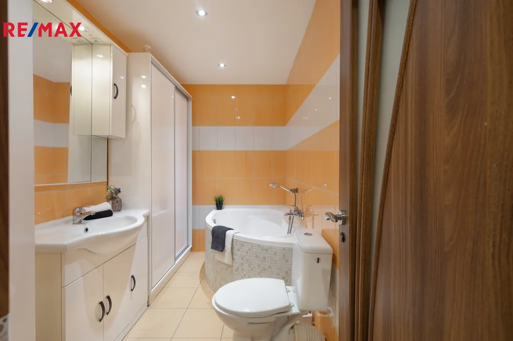 ✅ Koupelna spojena s WC, rohová vana a umývadlová skříňka s galerkou a bílé skříně