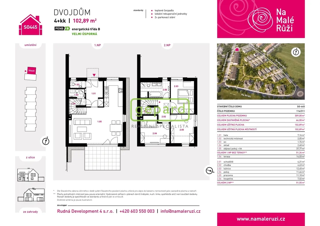 Realitní společnost Gepard nabízí prodej zděného řadového rodinného domu o dispozici 4+kk s terasou a parkovacím stáním o užitné ploše 103 m2 a pozemkem o ploše 309 m2. Jedná se o dostavbu 6. fáze projektu "Na Malé Růži" v rozvíjející se lokalitě Drahelčice, Rudná u Prahy. Projekt zahrnuje 40 +2 domů energetické třídy A a B a je ohraničen ulicemi Na Malé Růži, Jana Nepomuckého a Ke Hřišti.
