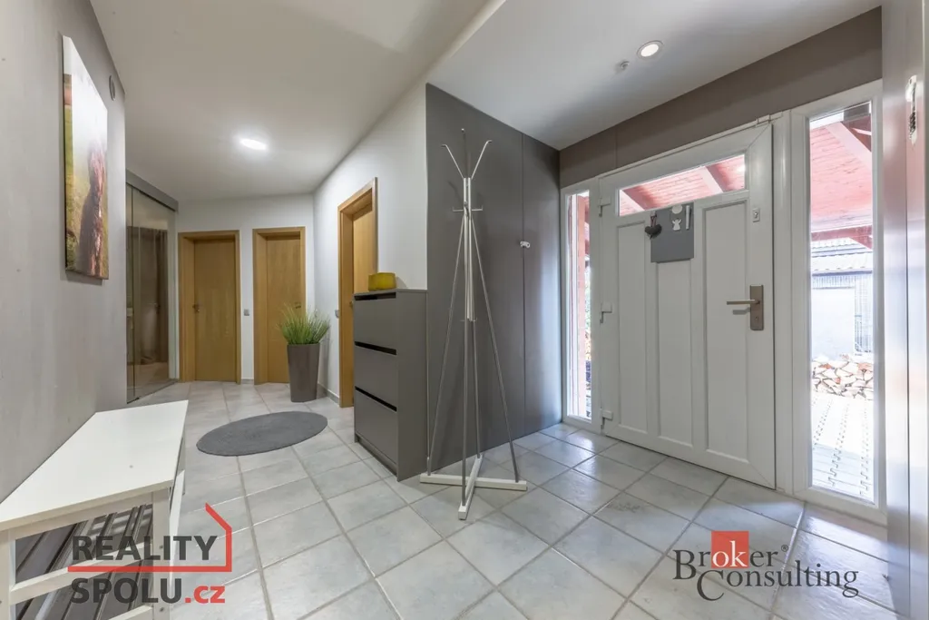 V přízemí se nachází vstupní hala, hlavní obytný prostor zahrnující moderní kuchyni, jídelnu a obývací pokoj s krbovou vložkou, pokoj pro hosty (či pracovnu), technickou místnost, šatnu, prádelnu, koupelnu a WC . V přízemí mohou noví majitelé využívat také útulnou zimní zahradu s kvalitní saunou. V podkroví se nacházejí tři ložnice, šatna, koupelna a WC. Parkování vozidel je zajištěno pod krytým parkovacím stáním a dalším místem pro stání za vraty. Dům je připojen na všechny inženýrské sítě (voda, kanalizace, elektřina, plyn) O efektivní vytápění se stará moderní tepelné čerpadlo v kombinací se solárními panely na střeše, což výrazně snižuje náklady na energie.