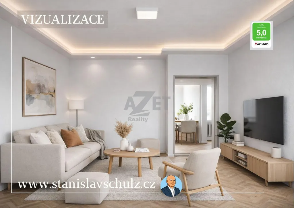 Byt nabízí zajímavý potenciál pro úpravu dispozice například vybudování šatny nebo pracovního koutku v obývacím pokoji.
