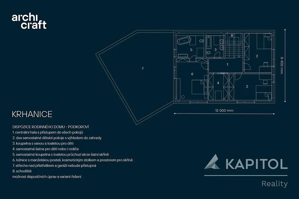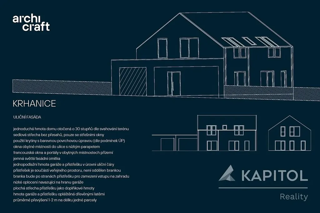 Projekt rodinného domu pochází od renomovaných architektů ze společnosti ARCHICRAFT. S nově vybudovanou příjezdovou komunikací, chodníky, včetně inženýrských sítí a technické připravenosti k výstavbě.