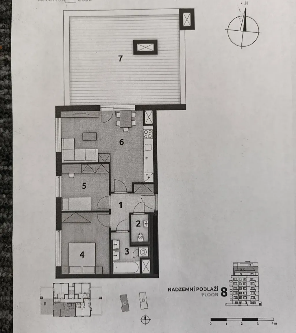 Podlahová plocha bytu 63,2 m2, terasa 45,42 m2.