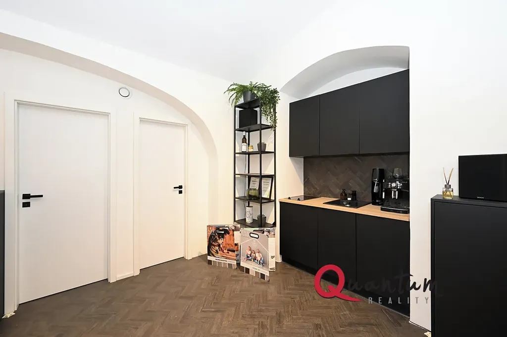 Prostor je orientován do klidného dvora a dispozičně řešen jako dvě místnosti se sociálním zázemím, které zahrnuje sprchový kout a WC. K dispozici je nová kuchyňská linka s vestavěnými spotřebiči (sklokeramická varná dvouplotýnka, malá lednice a myčka nádobí), jinak je prostor nezařízený, nábytek zobrazený na fotografiích patří současnému nájemci.