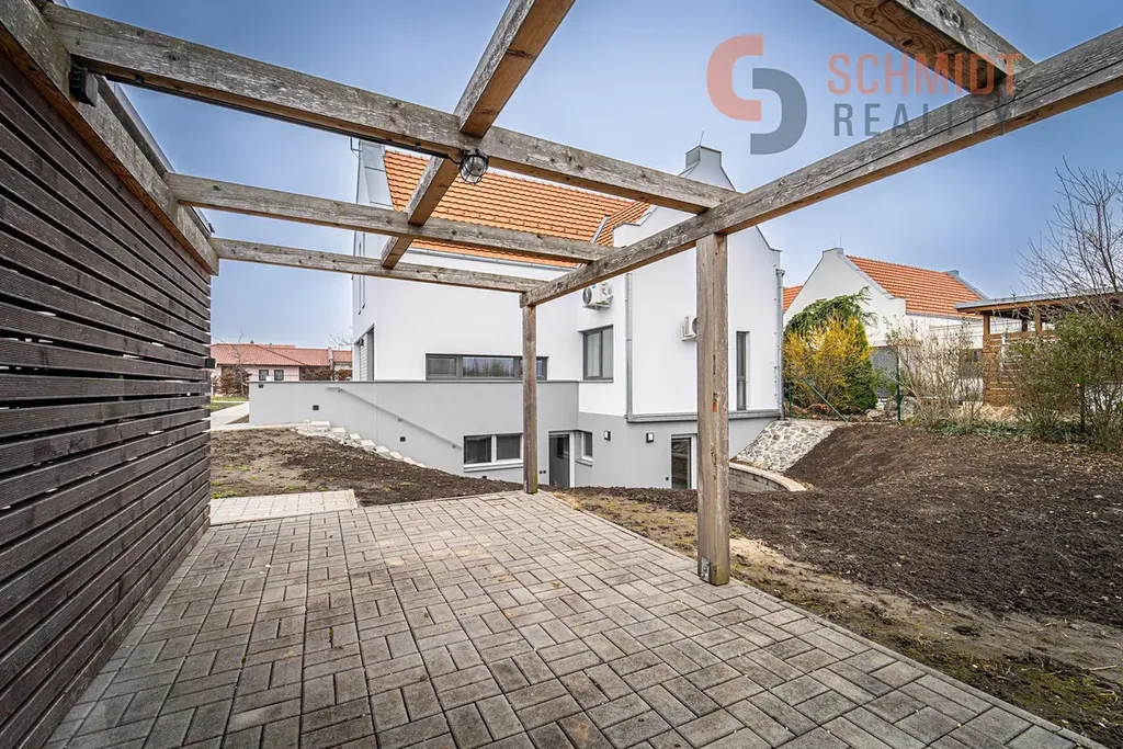 Byt se nachází ve 2NP, má velikost 3+kk (65m2) a patří k němu i společná terasa s pergolou na zahradě